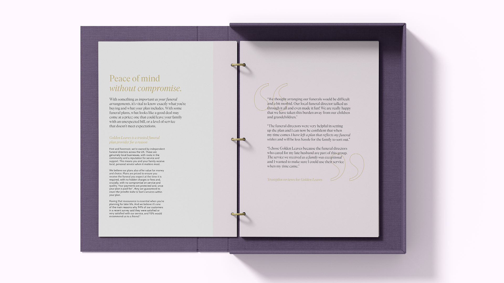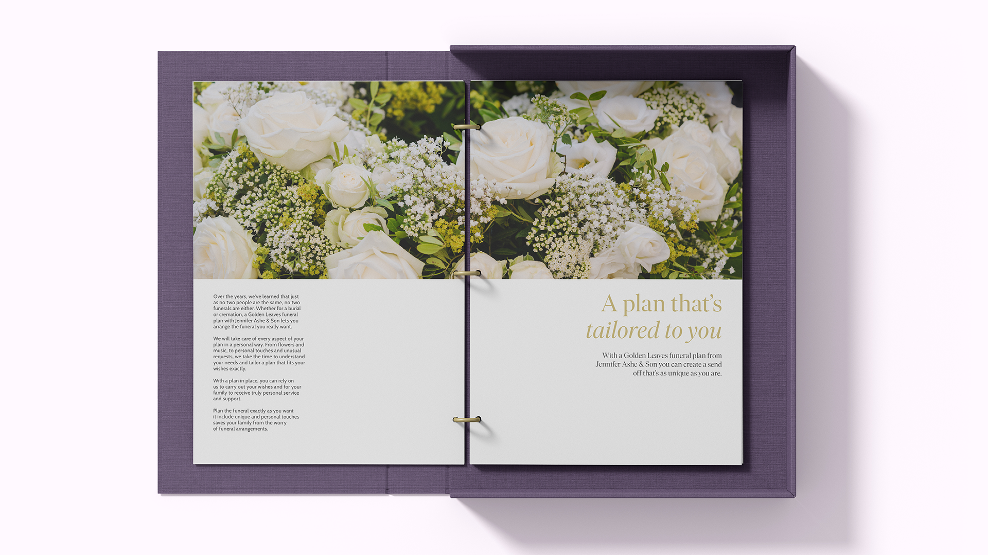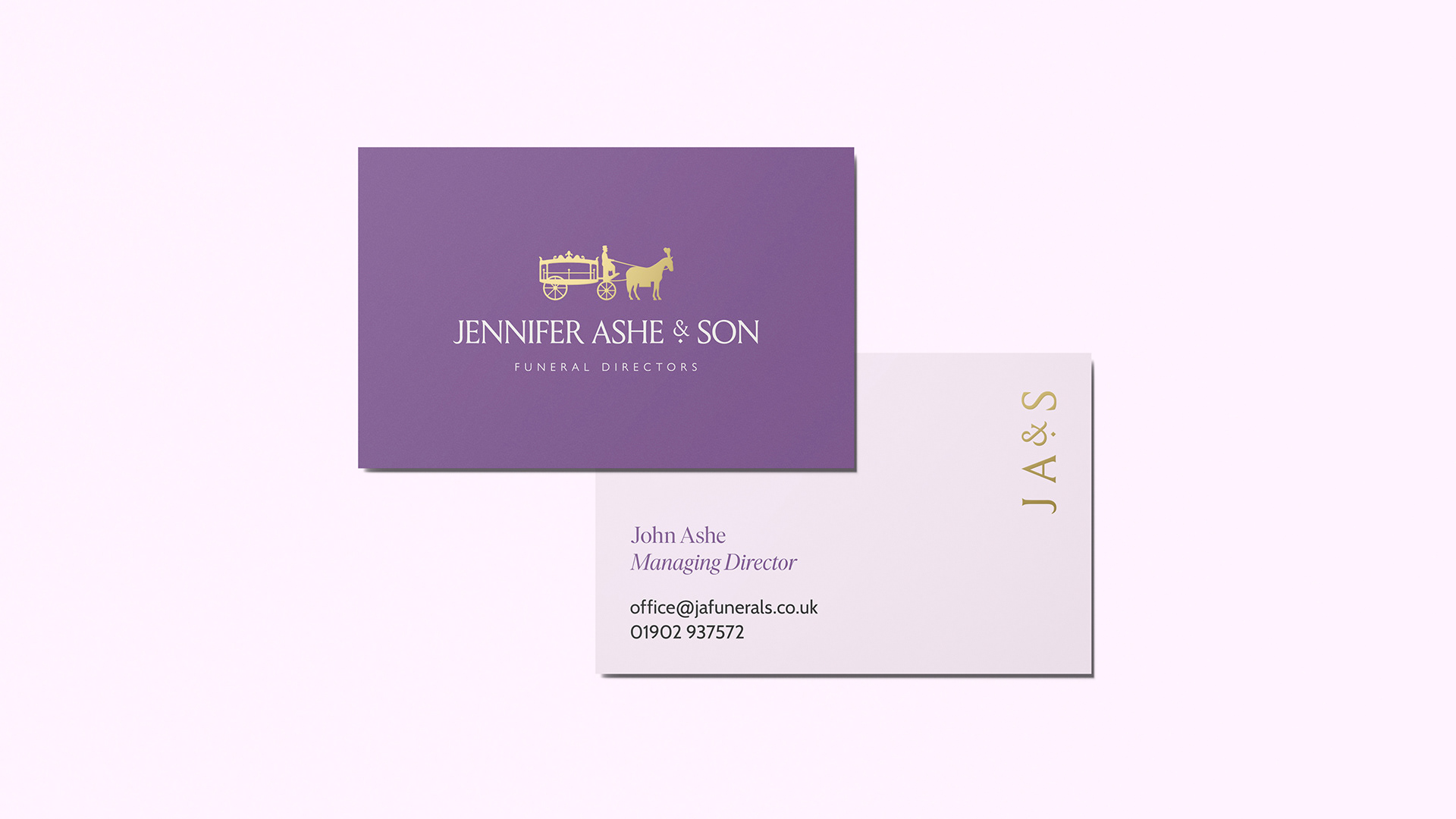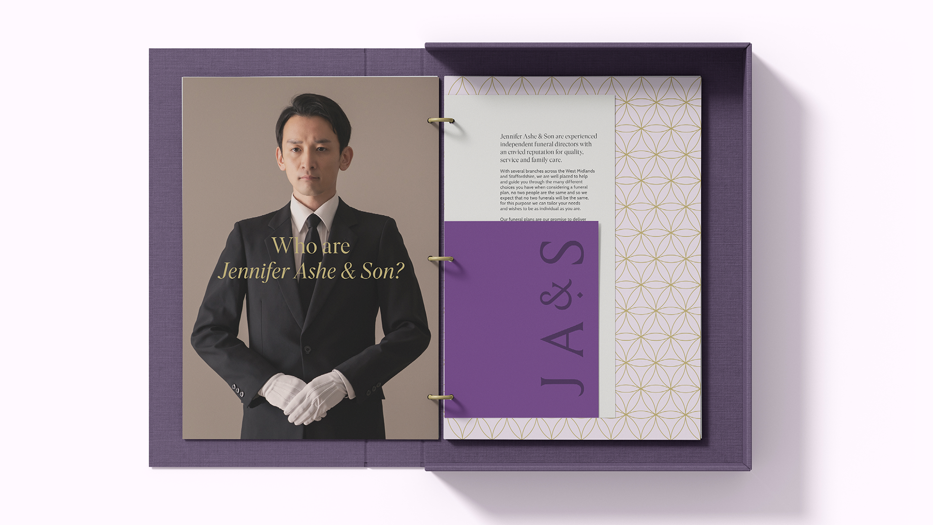Jennifer Ashe & Son are a family-owned funeral directors based in Birmingham. The branding was created with longevity and timelessness in mind. A classical silouhette logo is paired with stone-carved inspired typography. The graphic flower pattern references the flowers found at the majority of funerals.