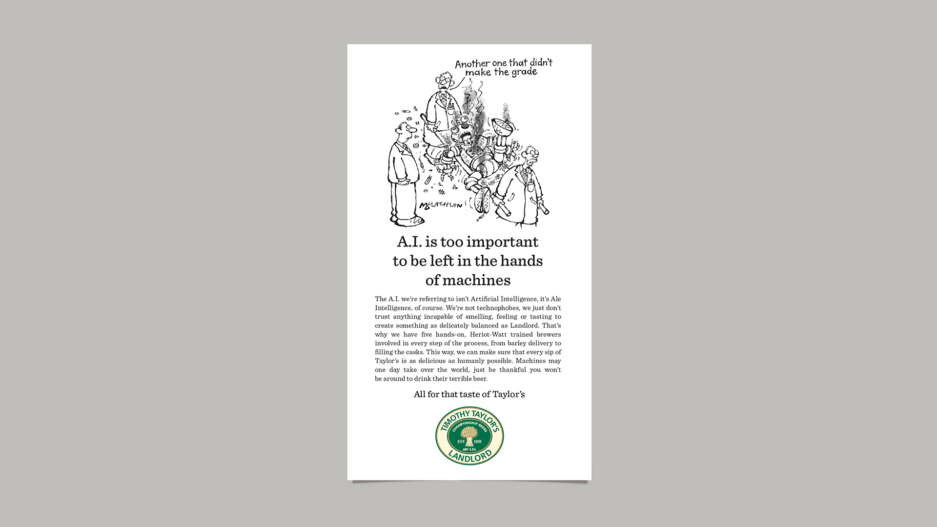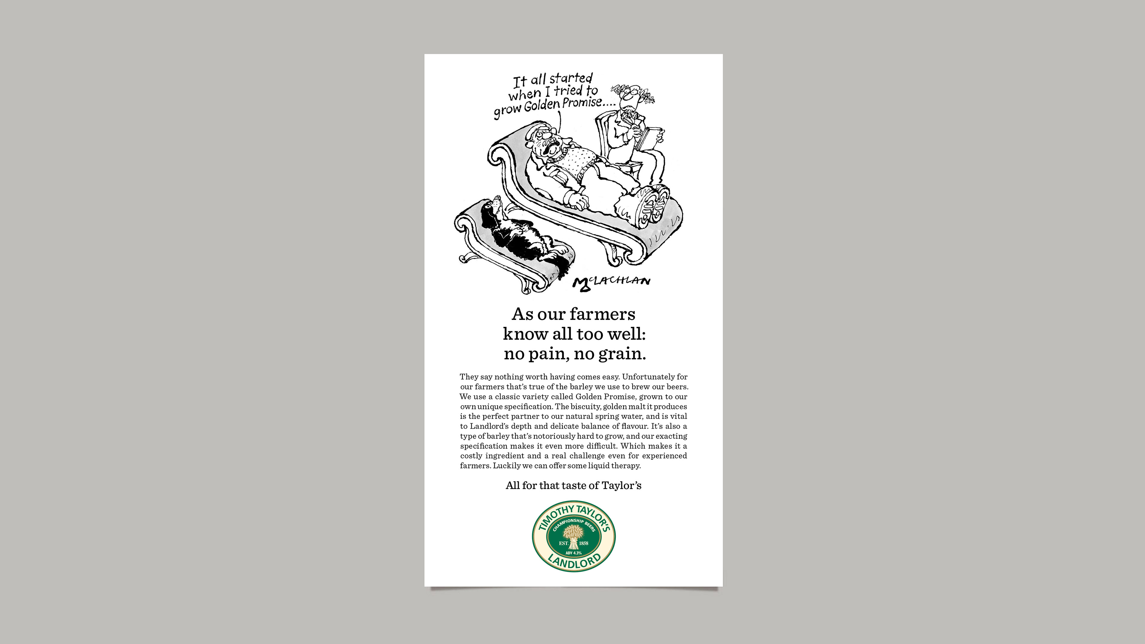 A series of ads that hightlight the challenging but worthwhile processes Timothy Taylor's forego to produce Britain's most lauded and awarded cask beer - Landlord.